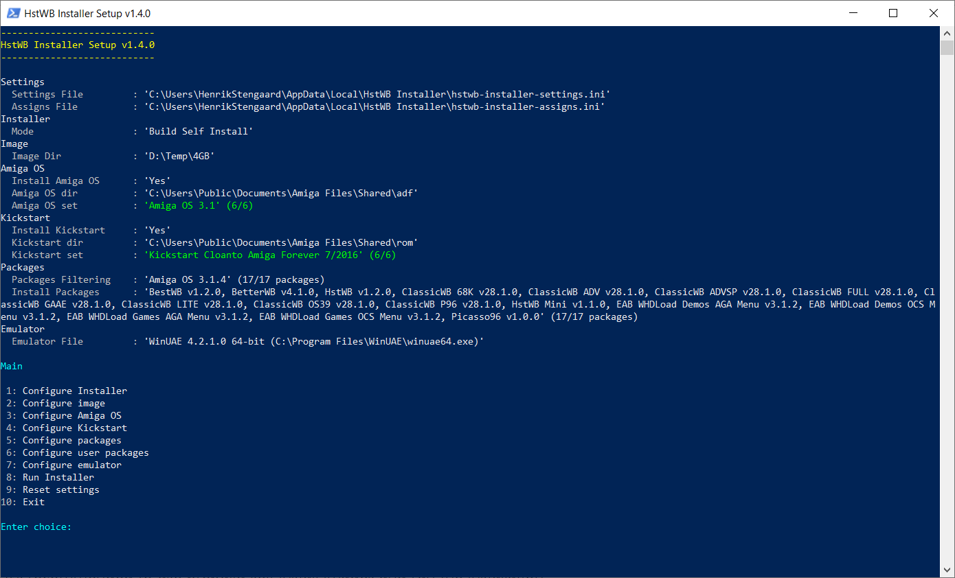 For more advanced installation, HstWB Installer can be run to build own customized images or self install images. HstWB Installer uses either WinUAE or FS-UAE emulator to build images
